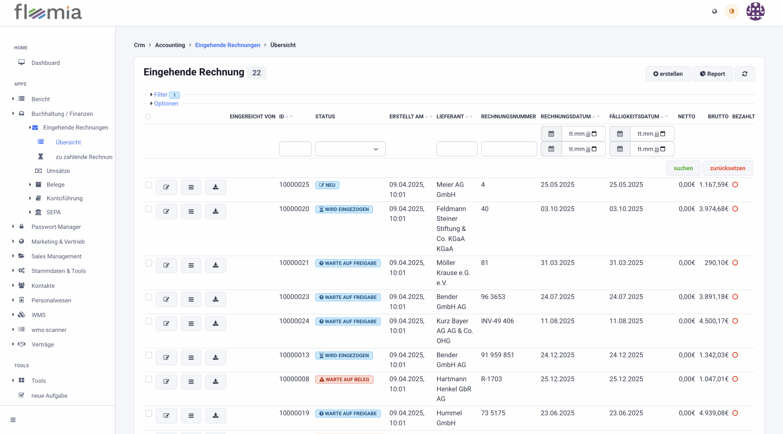Mit dem Modul Finanzbuchhaltung (FiBu) von Floomia ERP erhältst du ein leistungsstarkes Werkzeug, um alle finanziellen Transaktionen deines Unternehmens präzise zu verwalten. Von der Einnahmen-Überschuss-Rechnung bis zur Gehaltsabrechnung unterstützt dich Floomia dabei, deine Liquidität zu sichern, Kosten zu optimieren und fundierte Entscheidungen für nachhaltiges Wachstum zu treffen.